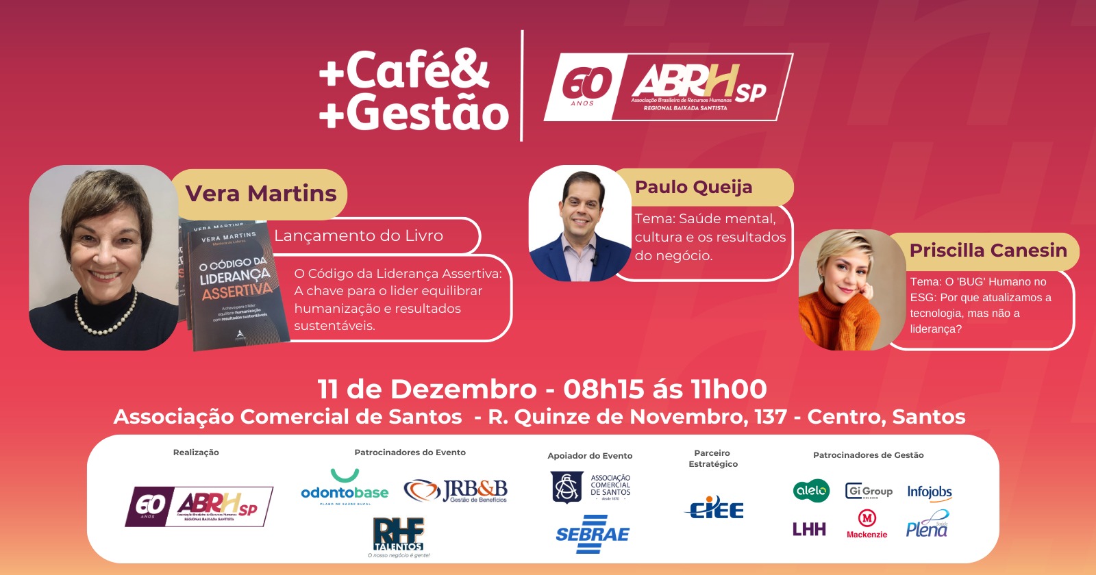 A ABRH-SP Regional Baixada Santista convida você para mais uma edição do +Café& +Gestão, evento que une networking, conhecimento e inspiração! Data: 11 de dezembro Horário: 08h15 às 11h00 Local: Associação Comercial de Santos - R. Quinze de Novembro, 137 - Centro, Santos Palestrantes confirmados: Vera Martins - Lançamento do Livro "O Código da Liderança Assertiva: A chave para o líder