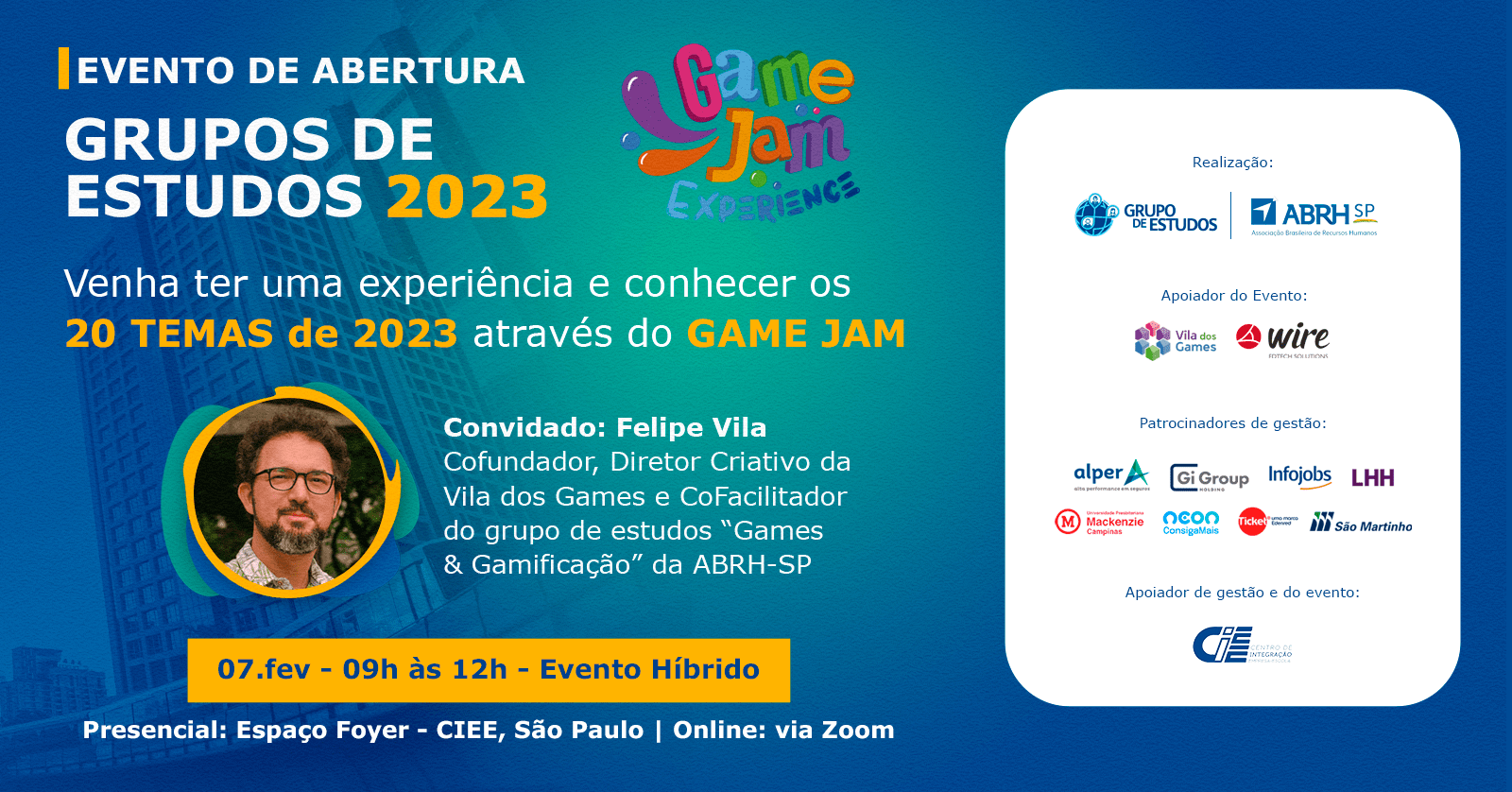 No evento híbrido, que marca a abertura dos Grupos de Estudos em 2023, Felipe Vila, cofundador, diretor criativo da Vila dos Games e cofacilitador do Grupo de Estudos Games e Gamificação da ABRH-SP, vai demonstrar os 20 temas do ano no formato Game Jam.