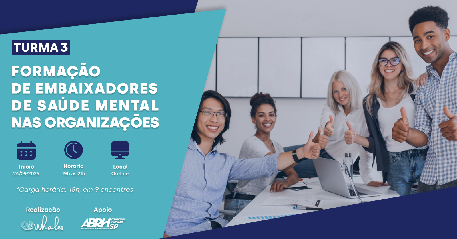 Com a proposta de capacitar profissionais de Recursos Humanos, Saúde Ocupacional, lideranças e demais interessados em atuar como agentes transformadores da cultura organizacional, a ABRH-SP, maior comunidade de RH do Brasil, e a Whales, consultoria especializada em desenvolvimento humano, promovem a 3ª edição da Formação de Embaixadores de Saúde Mental nas Organizações. O programa vai oferecer ferramentas práticas para implementar ações em conformidade com a Lei nº 14.831/2024 e com a atualizada NR-1. Em formato 100% on-line, com aulas ao vivo e interativas, a jornada vai capacitar os participantes para transformar a cultura de bem-estar das empresas. As inscrições já estão abertas e associados da ABRH-SP têm descontos: associados comuns, 70% e associados Premium, 75%. O primeiro, dos nove módulos da programação, está marcado para 24 de setembro de 2025.