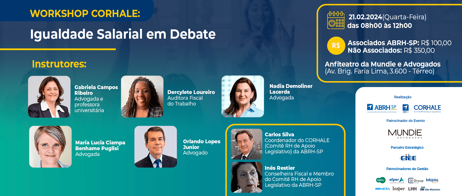 O CORHALE (Comitê RH de Apoio Legislativo), braço legislativo do sistema ABRH em todo o Brasil, promove na próxima quarta-feira (21/02), das 8h às 12h, o workshop “Igualdade salarial em debate”. O evento presencial será realizado no anfiteatro da Mundie Advogados, localizado na Av. Brigadeiro Faria Lima, 3.600, térreo, Itaim Bibi, em São Paulo (SP).