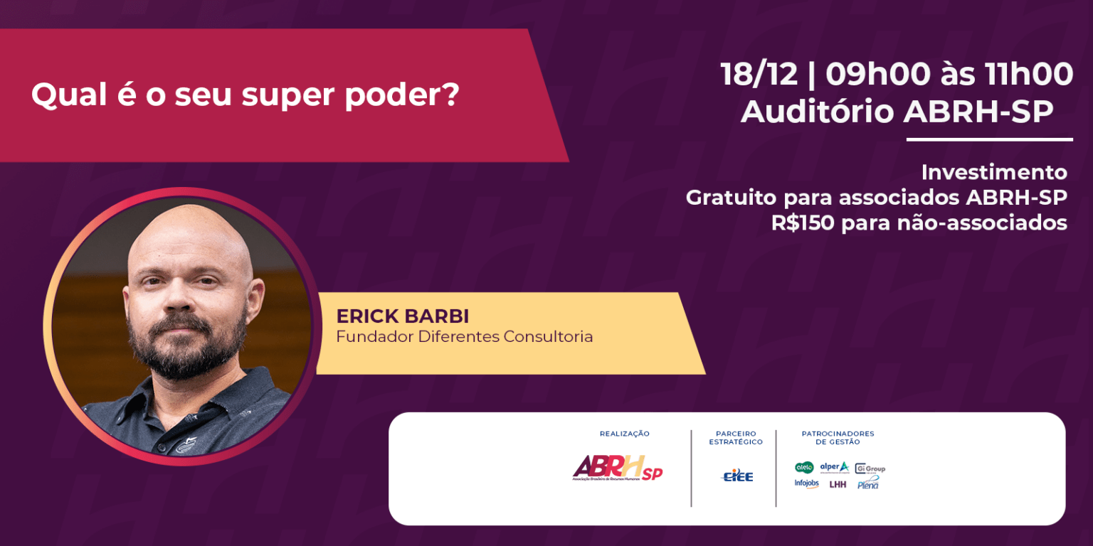 “Na palestra inspiradora ‘Qual é o seu super poder?’, Erick Barbi compartilha sua trajetória de superação, revelando como enfrentou dificuldades e preconceitos, transformando-os em combustível para alcançar seus sonhos. Ele apresenta estratégias práticas para lidar com adversidades, fortalecer a confiança e despertar uma mentalidade focada no crescimento e na resiliência”, destaca Eliana Mota, gerente de Conhecimento e Aprendizagem da ABRH-SP. “É uma oportunidade de descoberta e mostra como os profissionais podem assumir o controle de suas histórias, encontrar força interior e evoluir em todas as áreas da vida.”