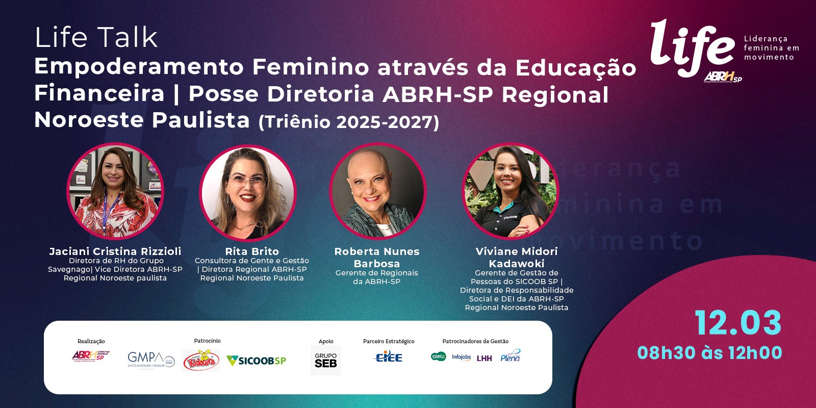 O Life Talk “Empoderamento feminino através da educação financeira”, que tem inscrições abertas, também marca a posse da diretoria da ABRH-SP Regional Noroeste Paulista para o triênio 2025-2027.