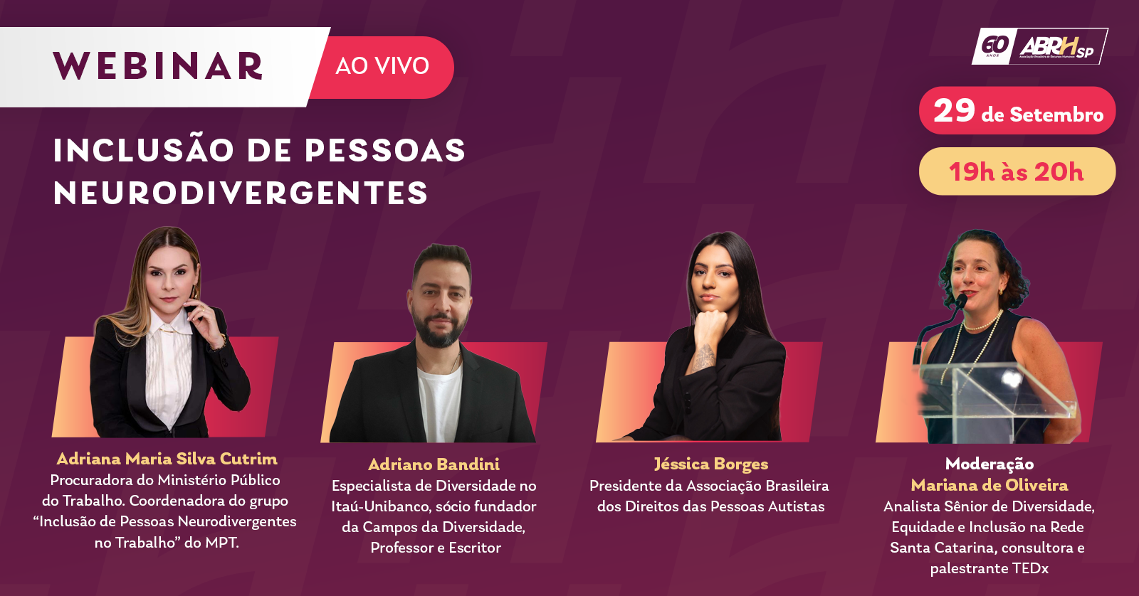 A ABRH-SP realiza nesta segunda-feira (29/09), a partir das 19h, o webinar “Inclusão de pessoas neurodivergentes”. Para debater um tema cada vez mais urgente e estratégico nas organizações, o evento on-line, via YouTube, reúne profissionais que são referência no mercado de trabalho. Com inscrições gratuitas, o encontro traz experiências pessoais, corporativas e institucionais que inspiram e orientam as empresas na construção de ambientes mais justos, diversos e acessíveis.